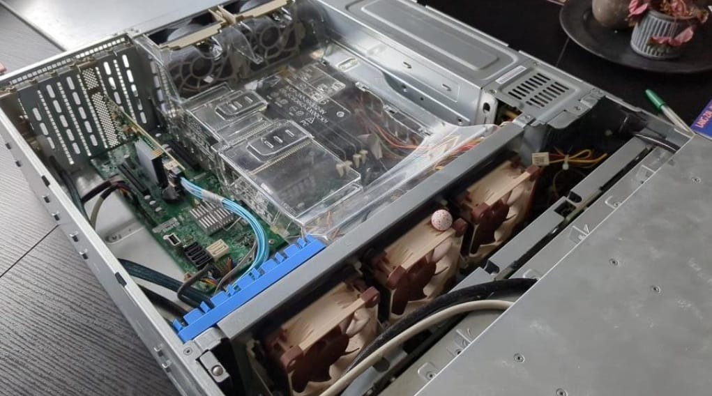 De NAS kwam met luide 15K RPM ventilatoren om alles koel te houden. Om de geluidsproductie enigszins in de perken te houden heb ik drie aftermarket ventilatoren gekocht van het merk Noctua. Dit merk staat er om bekend om kwalitatieve en stille ventilatoren te bieden. De nieuw geplaatste ventilatoren doen hun werk op slechts 2,2K RPM. Het risico wat ik loop met deze aanpassing is dat de server niet koel te houden is. Nadat de ventilatoren geplaatst zijn heb ik een stress-test uitgevoerd om te garanderen dat zelfs op de warme dagen de temperatuur van de CPU binnen de grenzen vallen. De metingen kwamen uit op vijfenzeventig graden, dit is acceptabel volgens de specificaties van Intel.