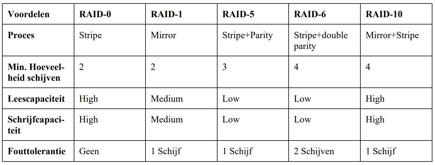 Betreft het onderwerp opslagconfiguratie: RAID is een manier om de capaciteiten van opslagmedia te parralelliseren. Het effect hiervan is tweeledig: er kan gekozen worden voor redundantie in de datapoule door middel van pariteit, er kan ook gekozen worden voor meer bandbreedte door de workload te verdelen over de verschillende schijven. Daarnaast zijn er configuraties beschikbaar die beide in mindere mate faciliteren.
