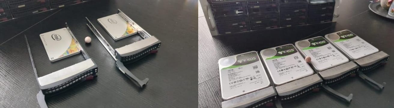 Voor het besturingssysteem worden twee Intel 530 SSD’s van 240 GB gebruikt in een zachte RAID-1 configuratie voor redundantie. Voor de opslag-poule wordt gebruik gemaakt van vier Seagate Exos 12 TB SAS drives in combinatie met een zachte RAID-5 configuratie.