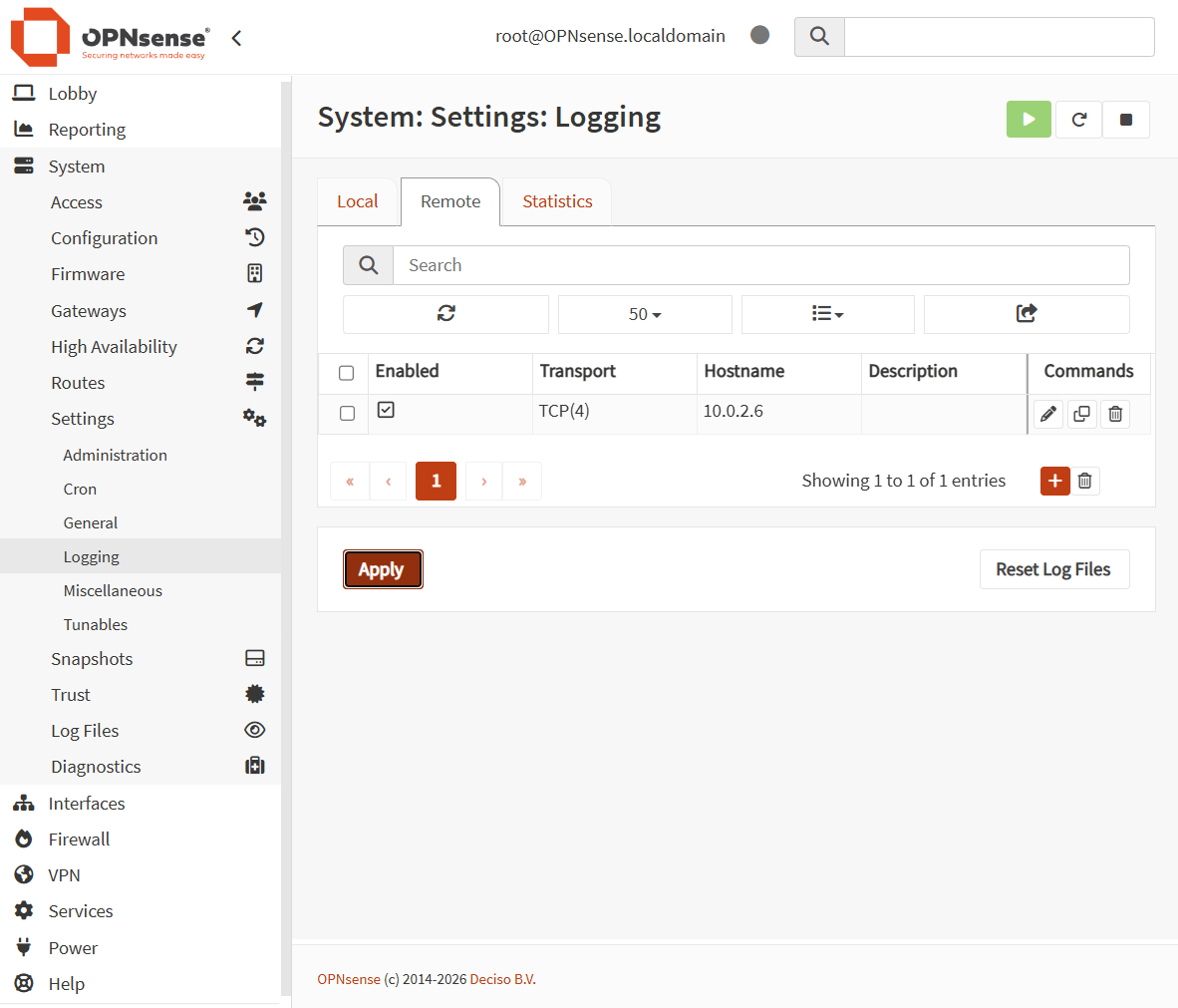 Dezelfde configuratie passen we toe bij de Docker host DockerLocker, immers draait die ook op Debian. Voor OPNsense is het een iets ander verhaal; Die draait xBSD als besturingssysteem en heeft een mooie web-UI waar remote logging aangezet kan worden.