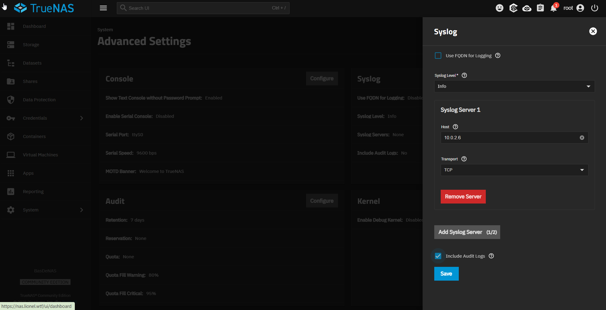Een van de (vele) dingen die ontbreken in m'n lab is remote logging. Het nut ervan is misschien omstreden omdat ik een zero-trust policy over m'n eigen LAN nu nog te ver vind gaan. Ik verwacht niet dat hackers inbreken en de lokale logbestanden verwijderen en als alles werkt heb je geen logging nodig. Toch?