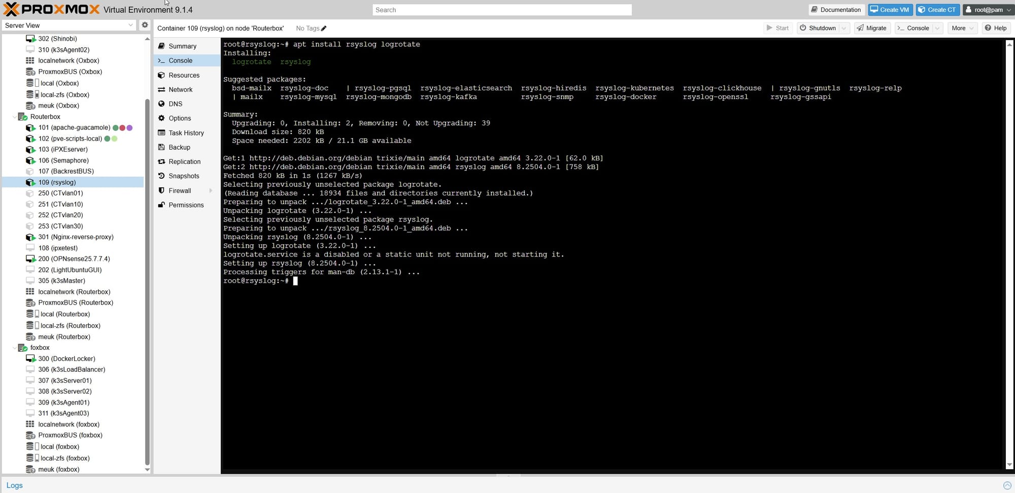 Als test case wil ik remote logging toepassen op een Docker host, Proxmox node, OPNsense en een TrueNAS box. Ik begin met het aanmaken van een CT op RouterBox omdat die server op papier de hoogste uptime heeft. Veel bronnen heeft ie niet nodig, 1 vCore en 512 MB RAM is prima voor dit soort doeleinde. Voor het gemak maar even SSHd aangezet met PermitRootLogin yes. Daarna 'apt install rsyslog logrotate' om de kern van dit project te downloaden.